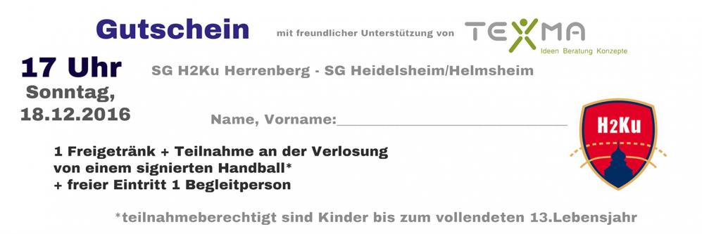 Am Sonntag spielt um 17 Uhr unsere SG H2Ku ihr letztes Spiel 2016 in der Markweghalle. Neben Schupfnudel und Glühwein haben sich die Verantwortlichen noch einmal etas ganz Besonderes ausgedacht.Alle Kinder bis zum vollendeten 13. Lebensjahr, die zum Spiel am Sonntag in die Markweghalle kommen, erhalten an der Tageskasse einen Gutschein, der einerseits ein Freigetränk beinhaltet, andererseits aber auch gleichzeitig als Los für einen von zwei Handbällen mit den original Unterschriften der Spieler der ersten Männermannschaft dient. Die Bälle werden freundlicherweise von der TEXMA GmbH zur Verfügung gestellt.