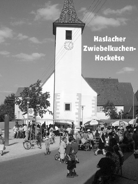 Das einzig Beständige am diesjährigen Sommerwetter ist wohl das Unbeständige. Den Organisatoren und Helfern der diesjährigen Zwiebelkuchenhocketse in Haslach stand öfters am Tage die Ungewissheit ob der immer wieder vorbeiziehenden Regenwolken ins Gesicht geschrieben. Und so ging der Blick auch öfters nach oben zum Himmel als nach unten ins Bierglas oder die Kaffeetasse. Letztendlich war der Wettergott den Haslachern aber relativ milde gestimmt. Das war aber beileibe nicht das einzige positive Fazit, was das Organisationsteam um Peter Jüngling und Michael Rott ziehen konnte. Das Konzept, die Hocketse neben Altbewährtem mit kulturellen und sportlichen Angeboten zu untermalen, ging, sieht man sich die Besucherzahlen des Tages an, voll auf. Der stellvertretende Vereinsvorsitzende Klaus Pflugfelder sah es genauso: "So einen Ansturm wie diesmal hatten wir seit Jahren nicht". So musste das Team im Backhaus um "Bäckermeister" Manfred Reschke pausenlos die in der nicht kleiner werdenden Warteschlange hungrigen Gäste mit frischem Zwiebelkuchen versorgen. Als Belohnung gab es dafür aber auch den trockensten und wärmsten Arbeitsplatz des Tages für das Backteam inklusive. Aber auch an den anderen Ständen war reges Treiben zu verzeichnen. Nicht nur einmal mussten am Grillstand rote Würste oder Grillfleisch nachgeordert werden und die wilden Kartoffeln waren auch dieses Jahr wieder heiß gegehrt.