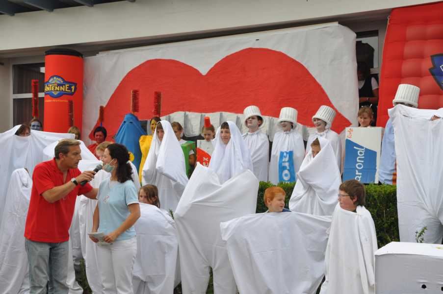 Die Aufgabe, die von den erwartungsvollen Haslachern gelöst werden sollte, hatte es nämlich in sich. Wohl als Beitrag zur Gesundheitsreform sollten sich die Teilnehmer als Zahnbürsten, Zahnpastatuben, Zahnseidepackungen und als Zähne in Lebensgröße verkleiden. Außerdem musste ein überdimensionales Bild von einem Mund mit Zähnen erstellt werden. Nach den ersten Absprachen schwärmte man in alle Himmelsrichtungen aus, um notwendige Materialien heranzuschaffen. So wurde manch Speicher auf der Suche nach Brauchbarem durchforstet. Nach wenigen Minuten surrten plötzlich schon zwei Nähmaschinen, die aus weißen Stoffen und Tücher Overalls für Zähne zauberten. Jeder war mit Feuereifer bei der Sache, wo eine Hand gebraucht wurde, war sie sofort zur Stelle. Manch einer, eigentlich nur zum Zuschauen gekommen, wurde von der guten Stimmung angesteckt und fand sich plötzlich mitten im Geschehen wieder. Für die jüngsten Besucher war natürlich ein Blick hinter die Kulissen der Radiomacher eine aufregende Sache. Auffallend war auch die Tatsache, dass sich die Spielmannschaft aus allen Altersgruppen rekrutierte, von acht bis achtzig alle zum Helfen bereit waren. Ein schöner Beweis dafür, so Michael Rott, der Vereinsvorsitzende des TVH, dass die Gemeinschaft in Haslach noch funktioniert. Ein weiteres Beispiel hierfür lieferte das Fehlen von Farbe für die anzufertigenden Modelle und Kostüme. Kurzerhand wurde die Malerfirma Weik aus Haslach angerufen. Und um die These des Gemeinschaftsgefühls unter Beweis zu stellen, wurden sofort und unbürokratisch Farben zur Verfügung gestellt. Als um zwölf Uhr das tolle Gesamtbild, was Sie übrigens neben vielen anderen in unserer Galerie bestaunen können, fertig stand, war der Jubel verständlicherweise groß. Ein besonderer Blickfang war neben den tollen Kostümen das riesige,sehr gelungene Präsentationsplakat. Die wichtigste Erkenntnis des Vormittags war aber wohl die Genugtuung darüber, das man sich in Haslach noch aufeinander verlassen kann. Dies auch mal in die weite Radiowelt hinaustragen zu können, war sicher allein schon den Aufwand wert. Auch deshalb bedankt sich der TV Haslach noch einmal ausdrücklich bei allen Helfern, die diesen Erfolg möglich machten.